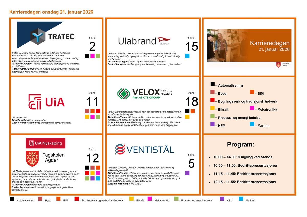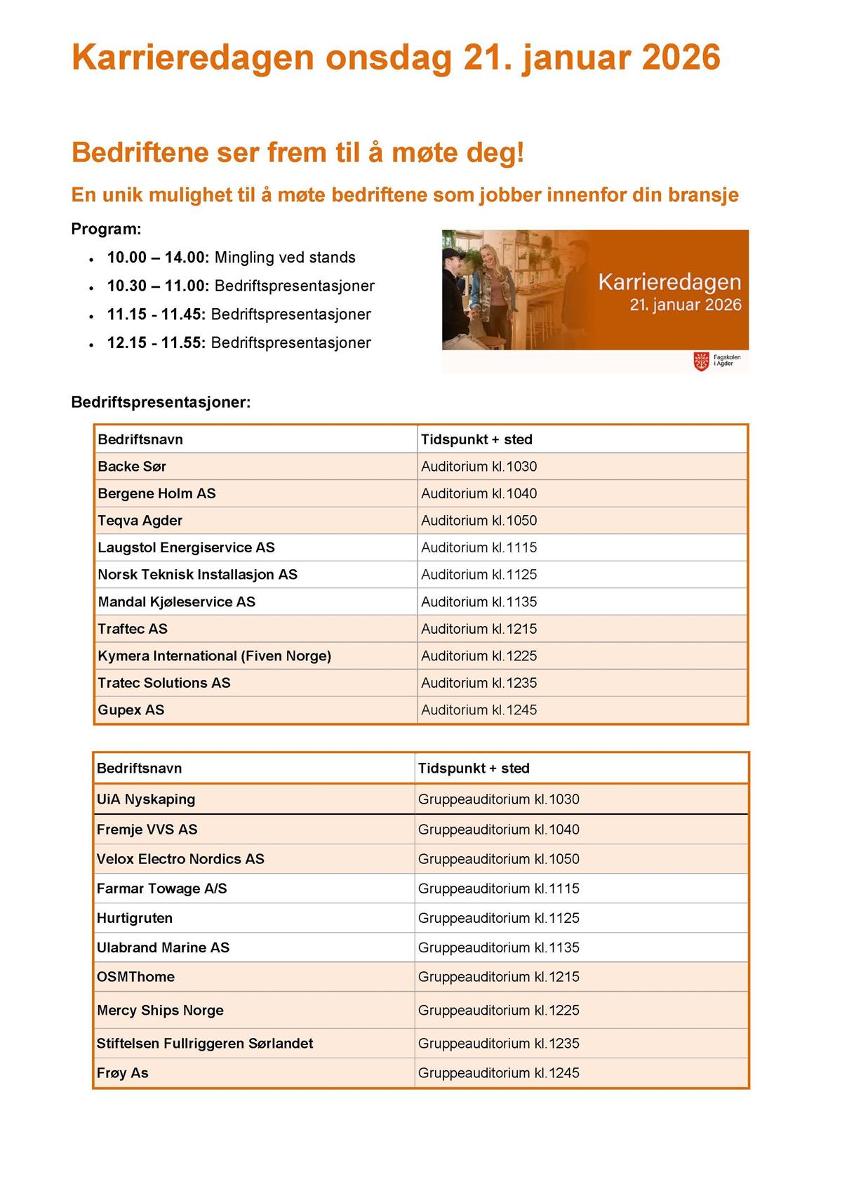 Onsdag 21. januar åpner Fagskolen i Agder dørene for årets karrieredag – en møteplass der studenter og bedrifter knytter verdifulle kontakter, deler kunnskap og utforsker fremtidige jobbmuligheter. Dette er dagen for å bygge nettverk, bli inspirert og ta det første steget mot din fremtidige karriere. Bedriftene stiller med stands, presentasjoner og aktiviteter, og ser frem til å møte engasjerte studenter fra våre tekniske og maritime fagområder.